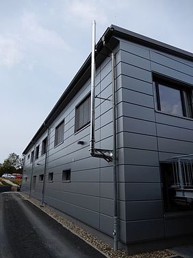 Für die Heizungsanlage im Bauhof der Stadt Lichtenfels haben wir die optisch zur Fassade passende Abgasanlage und die Kaskade der Gasbrennwertfeuerstätten erstellt